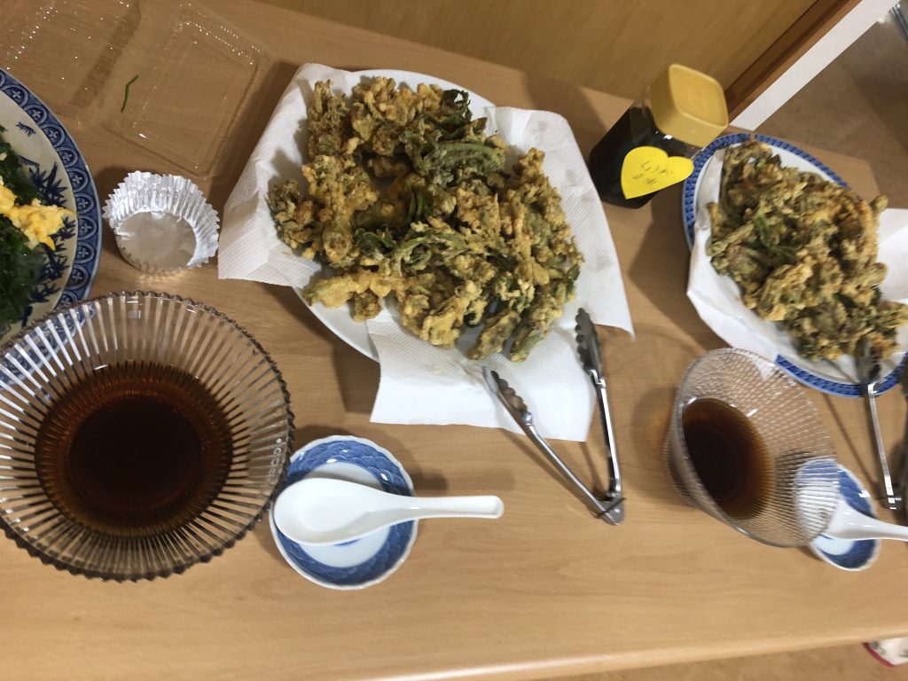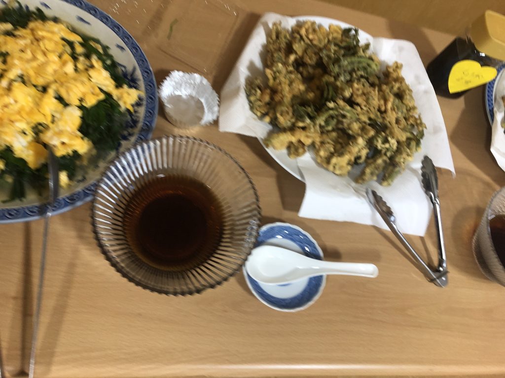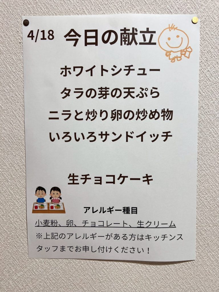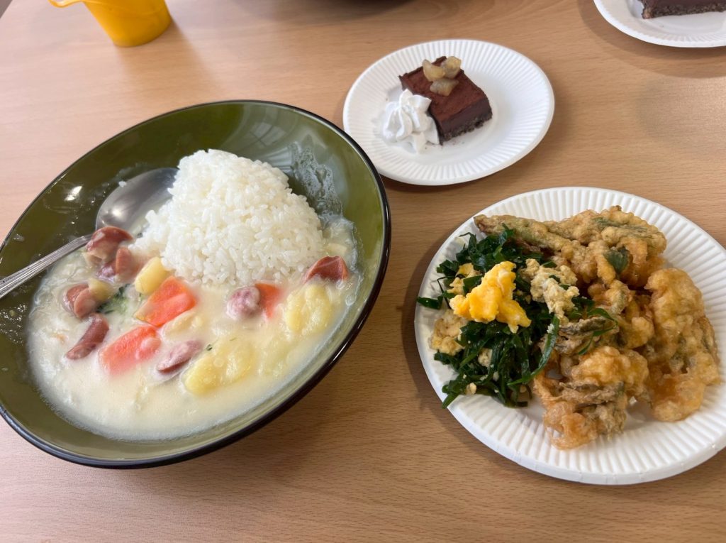 4月18日(土)、リニューアル後の第1回となる「さーくる青空食堂」がついにスタートしました。記念すべき初回のメニューは、心も体もほっと温まるホワイトシチュー✨ さらに、差し入れでいただいたタラの芽の天ぷら、そしてニラと炒り卵の炒め物が食卓を彩り、春らしい豊かな食事になりました。
