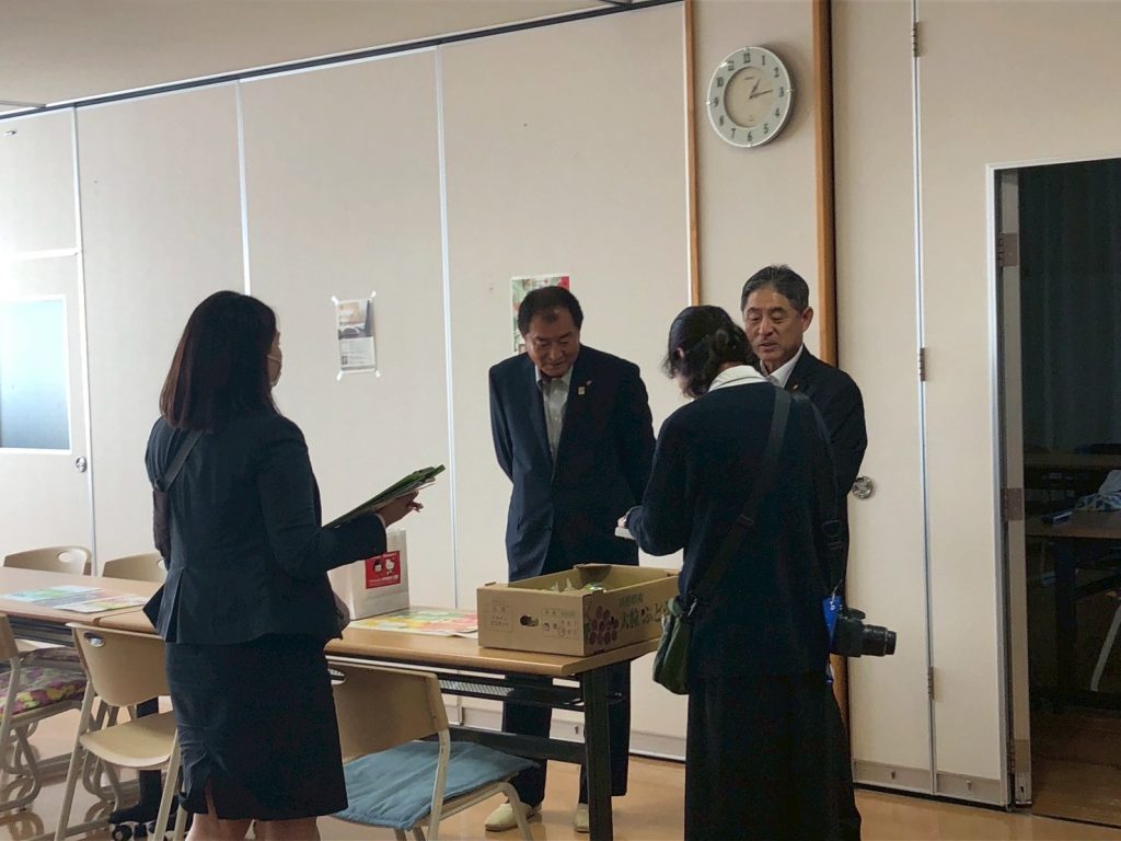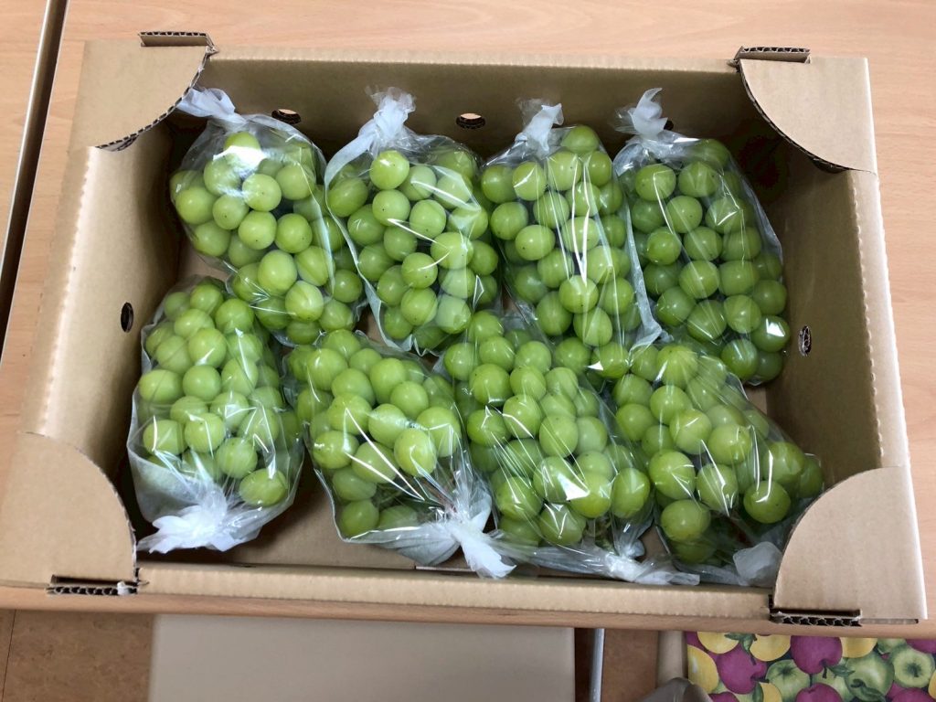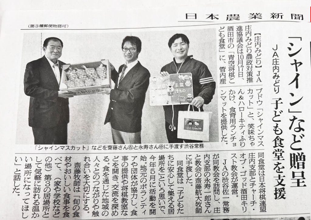 10月17日午後1時15分頃、酒田キリスト教会にて、JAグループ山形様より山形県産秋の旬の食材を頂戴いたしました。贈呈品は、シャインマスカット5kg(1箱)の他、ランチョンマット、笑味ちゃん&ハローキティふりかけと、明日の子ども食堂(食べ放題フェス)に花を添える、うれしいプレゼントとなりました。